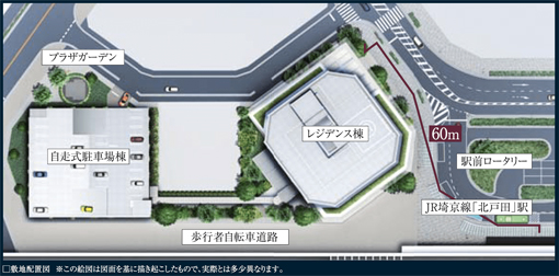 敷地内には、住宅と商業施設が入るレジデンス棟と、自走式駐車場が配置されています。また、駅前から続く歩道と歩行者用自転車道路によって、ゆとりと開放感が創り出されているだけでなく、〈北戸田ファーストゲートタワー〉は、壁面緑化や屋上緑化、さらに自走式駐車場棟の周囲にも広場空間や緑地が設けられており、街並の景観に貢献しています。