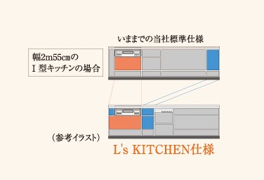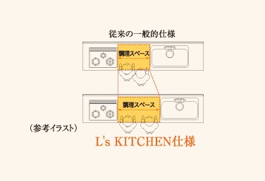 中央の調理スペースを広くとり、シンクの位置が端に寄せられた設計になっているため、親子や夫婦で料理を楽しむことができます。幅2m55cmキッチンの場合、今までの標準仕様のキッチンより約25cm~30cm中央の調理スペースが広くなっています。