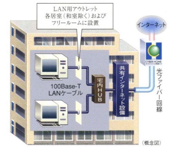 株式会社ファミリーネット・ジャパン(FNJ)のインターネットサービス「サイバーホーム」が導入されています。光ファイバーによるブロードバンドインターネットが実現されています。
