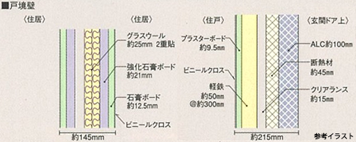 優れた耐震・耐久性の純ラーメン構造で、専有部外壁の内側には断熱性の高い硬質発泡ウレタン断熱材(厚さ40mm)を使用しているため、冷暖房効率が高められています。また、生活音対策として、床スラブをより厚くする(200~240mm)のはもちろん、戸境壁も乾式遮音耐火間仕切(TL-55)を採用し、音が伝わりにくい工夫が施されています。