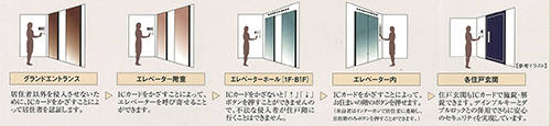 各住戸ごとに専用のICカードが発行されるため、グランドエントランスのオートロックドア、エレベーターの呼び出し、通用口や各共用施設のドア、住戸玄関の施錠・解錠など、全てがカード1枚で可能になっています。