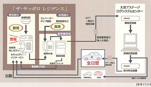 NTT回線を利用した独自の「L.O.G.(ライオンズ・オンライン・ガード)システム」で、24時間365日、先進の遠隔管理が行われています。火災などマンション内の異常事態を感知すると、管理事務室を通じてログシステムセンターに自動通報され、必要に応じて係員が警察や消防署へ緊急連絡を行うなど、迅速に対処してくれます。