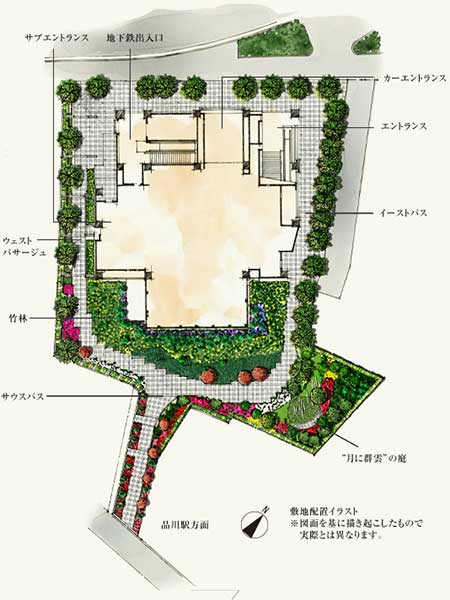 仕事に追われている時、日常の営みに囚われている時、人は緑の存在を心から忘れてしまいがちになります。しかし、思いが仕事から離れ、忙しさから解放されると余裕が生まれ、心は自由に浮遊し始めます。浮遊した心が着地する場所。そんなイメージを思い描きながら、タワーの南側には竹林と常緑樹によって展開される庭園風景が設えられています。テーマは、自然と建築の対比。風にそよぐ緑の影や光たゆたう木洩れ日が建物に映し出され、優美なシーンが居住者の心を癒します。