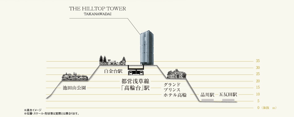 高輪という地名は旧く、始めは「高縄」と書いたという説が有力です。「高台にある真っすぐな道」、「舟人の言葉で、陸を高と言ったことから」など、由来は諸説ありますが、「高」という字が高い場所を意味する説が多くあります。海抜28mのここは、都心が見上げる丘。高級住宅地として名を馳せる城南五山※さえ見上げる高嶺のその上に、地上28階建てのタワーがそびえ建っています。ヒルトップから、さらに高みを目指すかのように天空に向かって建物は気高く美しく佇んでいます。