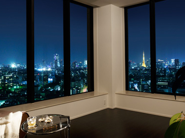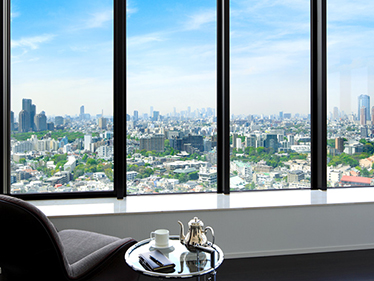 窓辺に座り、空と対峙する高輪の空から一望できる壮大なシーン。抜けるような青さは、いつ眺めても清々しく、焼ける空は、何度見ても感動的です。窓に浮かび上がる景色は、刻一刻と表情を移ろわせ流れる時を贅沢に仕立ててくれます。