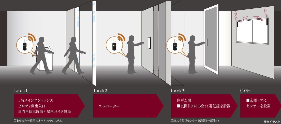Tebraキーを鞄やポケットに携帯しておくだけで、共用部のセキュリティが自動解錠されます。(認証距離:最大約2m)