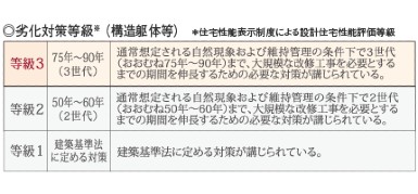 建物構造躯体に使用する材料の交換等、大規模な改修工事を必要とするまでの期間を伸長するための必要な対策の程度を表す設計住宅性能評価書における劣化対策等級は、最高等級の3を取得しています。