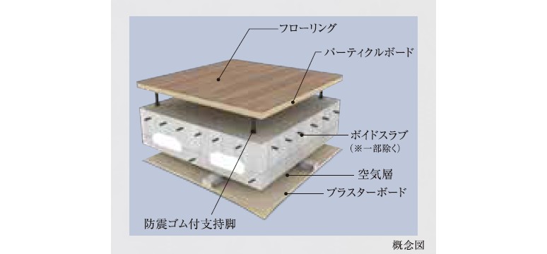 床と天井は、メンテナンスやリフォームが容易な二重床二重天井が採用されています。また、この機造形状によりΔLL(Ⅱ)‐3、ΔLH(Ⅱ)-2の床衝撃音レベル低滅量が確保されています。