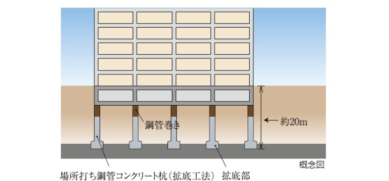 建設地にて事前に綿密な地盤調査と構造計算を行い、N値50以上の堅固な支持層に達する鋼管巻きコンクリート拡底杭により建物が支えられています。